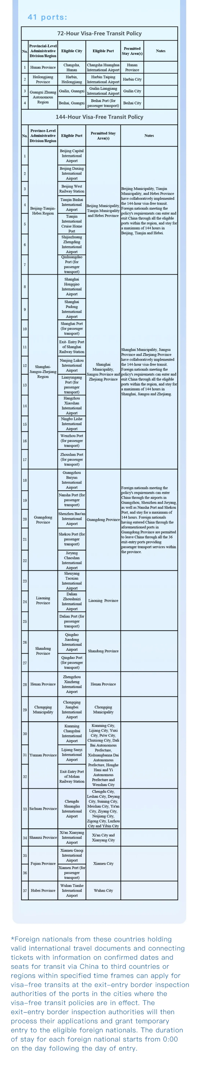The list of the ports in cities where the 72-hour and 144-hour visa-free transit policies are in effect is stated below.